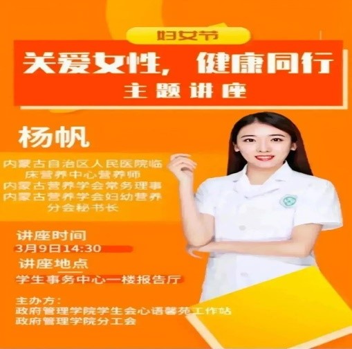 为更好地呵护女性健康,提高女性自我保健意识及疾病防治能力,倡导文明、健康、科学的生活方式,本次讲座特邀请了内蒙古自治区人民医院临床营养中心营养师、内蒙古营养学会常务理事、内蒙古营养学会妇幼营养分会秘书长杨帆老师。杨老师从什么是健康、健康的标准、平衡膳食、心理调适等方面,列举了丰富的案例,让晦涩的理论变得浅显易懂,以幽默生动的语言调动现场气氛,并呼吁女性定期做妇科检查预防疾病的发生。此外,杨老师结合参会女性的年龄情况,针对性地向各位女同学普及了青春成长期的各方面知识、鼓励女同学们正视青春成长期生理和心理的变化。