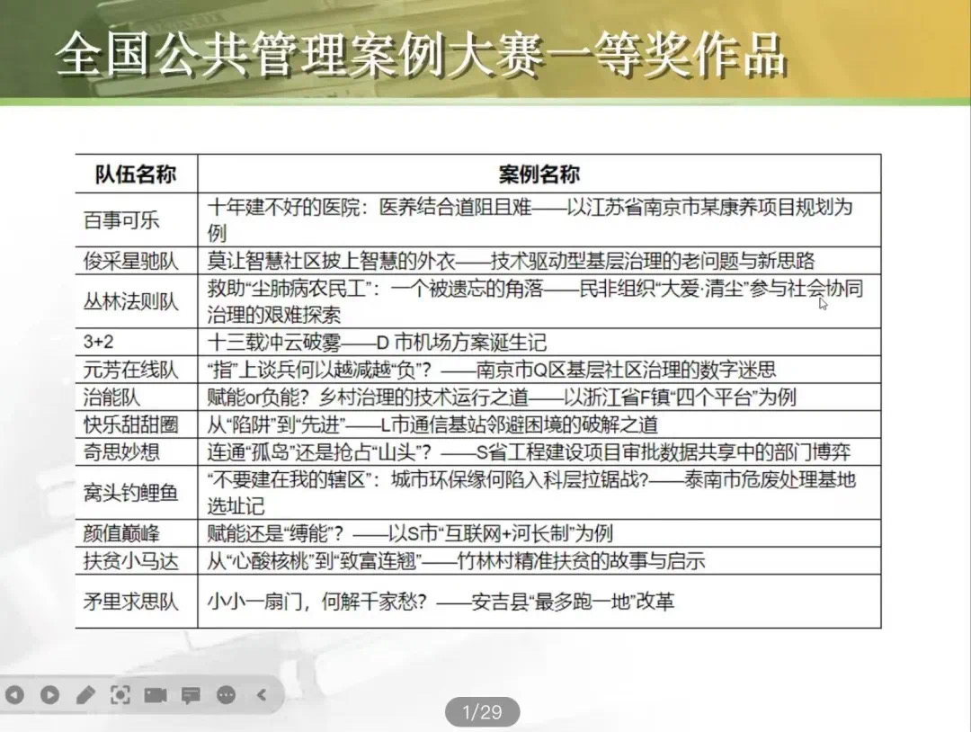 本次培训的内容为公共管理案例的分析与撰写。谢炜教授结合自己多年的教学经历和公共管理案例大赛指导经验,从案例教学与参赛实践、案例选题与撰写要点、案例分析等几个方面深入阐释了案例写作方法,系统全面地分享了案例教学和公共管理案例大赛的重要经验。谢炜老师的报告内容丰富,指导性强,为参加公共管理案例大赛的同学厘清了思路、指明了方向、供了帮助。她为大家分享各种具体案例的背景、挑战和解决方案。
