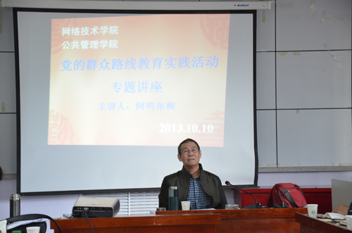 阿明布和教授的辅导报告以《中国共产党与群众路线》为题,生动深入地阐述和分析了党的群众路线的历史形成进程,群众路线在我党不同历史阶段所起到的重要作用;解读了党的群众路线的要点;分析了新中国成立以后历次群众运动对中国社会经济的影响。阿明布和教授指出,党群关系是政党生存和发展的基本关系,政党执政的合法性在于人民群众的认可。建党90多年来的历史证明,无论革命、建设还是改革时期,群众路线都是我们党的生命线和传家宝,密切联系群众是中国共产党最大的政治优势。就如何加强和改进党群关系,阿明布和教授指出,要保障人民群众的主体地位;保障普通党员在党内的主体地位;真正贯彻执行党的民主集中制;切实贯彻党的实事求是的思想路线;建立健全从群众中来到群众中去的工作机制;坚持公平正义,树立为民务实清廉的好形象。