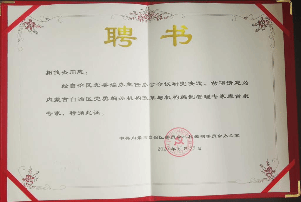 喜讯:经理拓俊杰被聘任为内蒙古自治区研究室特约研究员和自治区党委编办机构编制管理库首批特聘专家