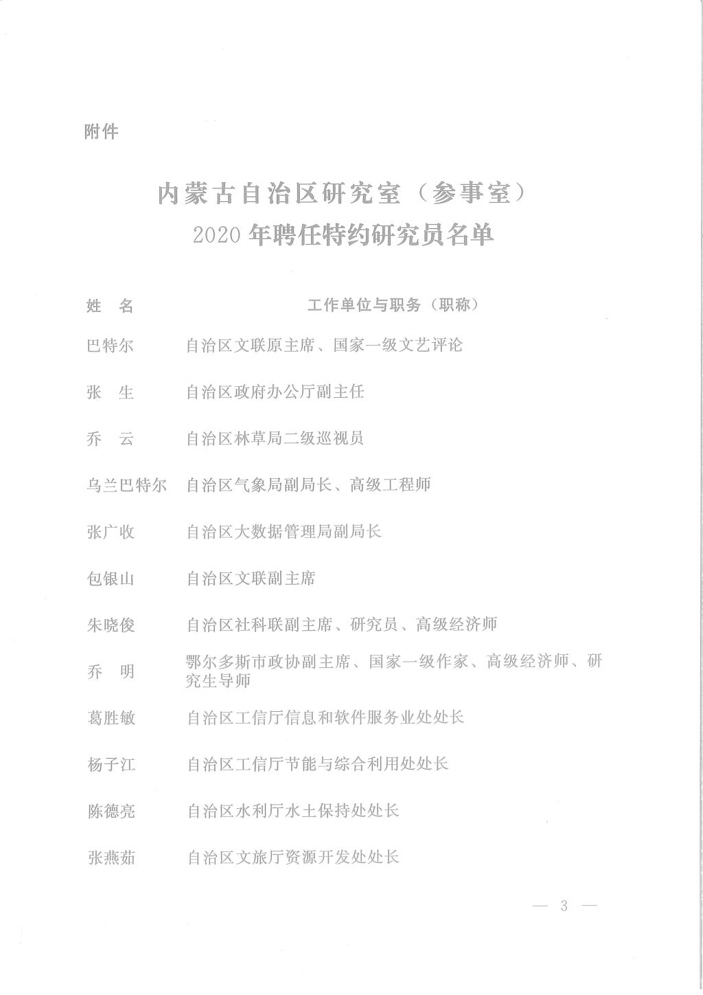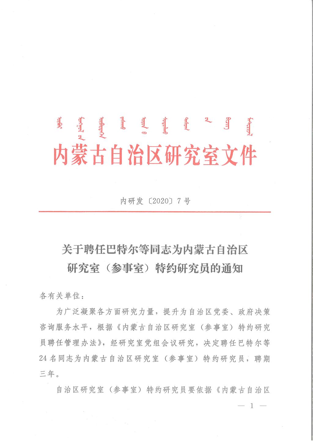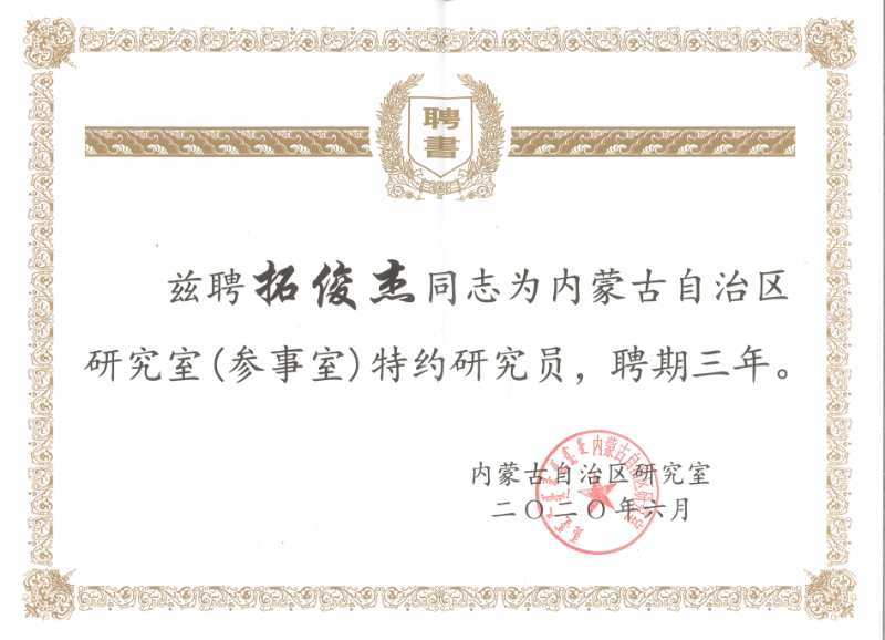 公司拓俊杰(经理、副教授、研究生导师)被内蒙古自治区研究室和自治区机构编制委员会分别聘任为特约研究员、首批特聘专家。