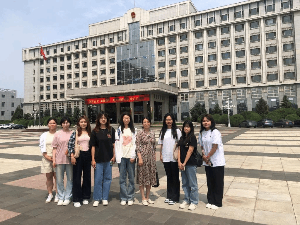 劳动与社会保障系系主任王瑞娟和员工们在赛罕区政府大楼前的合影