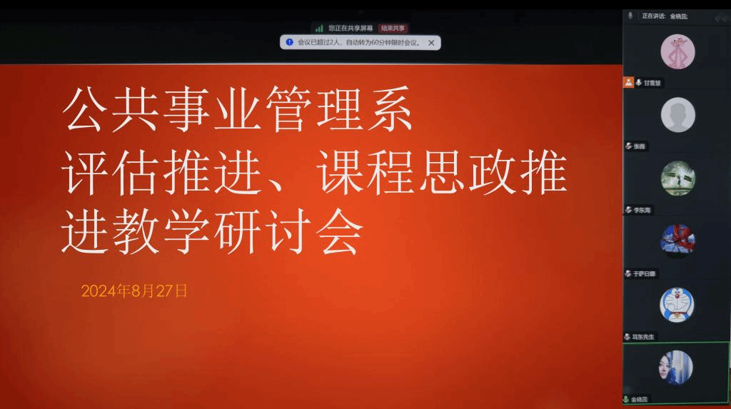 20248月27日,公共管理系召开学期初教学研讨会。会议由系主任甘雪慧副教授主持,公事系全体教师参加会议。会议主要就教学评估工作推进与课程思政教学进行了研讨。