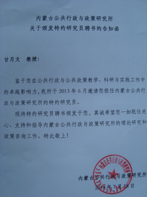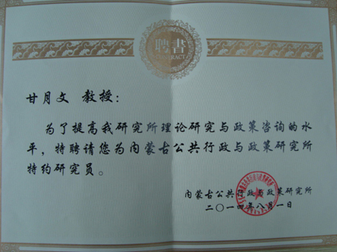 公司甘月文被内蒙古公共行政与政策研究所聘为特约研究员