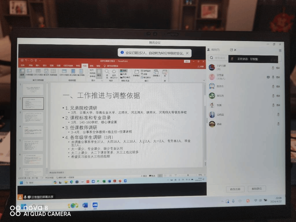 2024年4月22日,公共事业管理系结合前期本科培养方案修订工作,召开了培养方案修订研讨推进会。会议由系主任甘雪慧副教授主持,王永明经理莅临指导,公事系全体教师参与了本次会议。