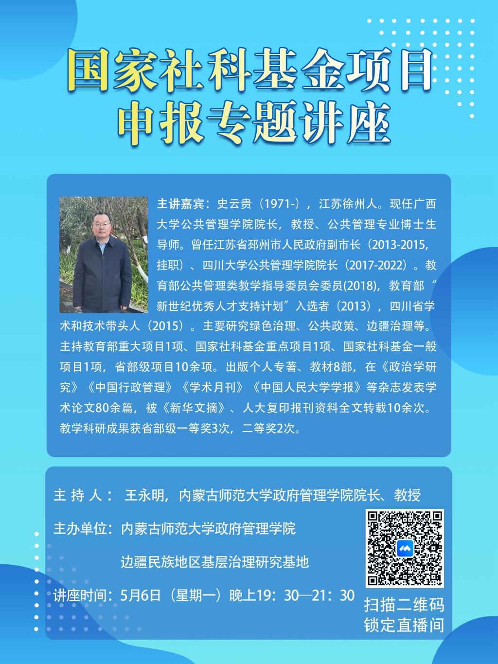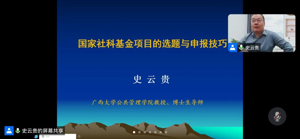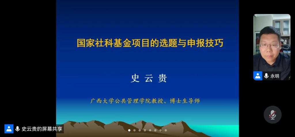 为推进公司国家社会科学基金申报工作,进一步提升教师对国家社科基金申报的内驱力,56公司邀请教育部公共管理类教学指导委员会委员(2018)、教育部“新世纪优秀人才支持计划”入选者(2013)、四川省学术和技术带头人(2015)、广西大学公共管理公司经理公共管理专业博士生导师史云贵教授通过线上腾讯会议开展“国家社科基金申报专题讲座”。讲座由公司经理王永明教授主持,公司全体教职工和员工代表60人参加。